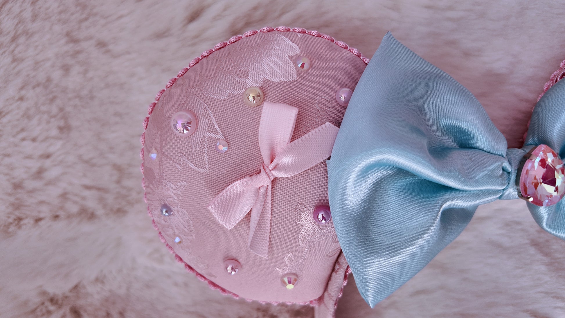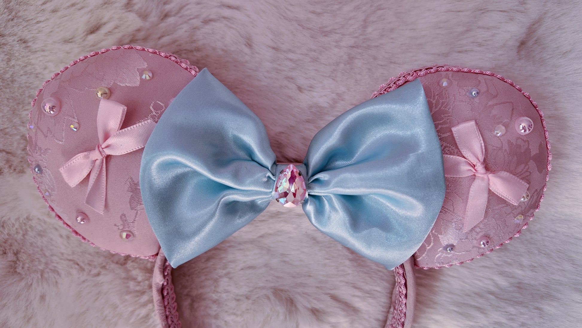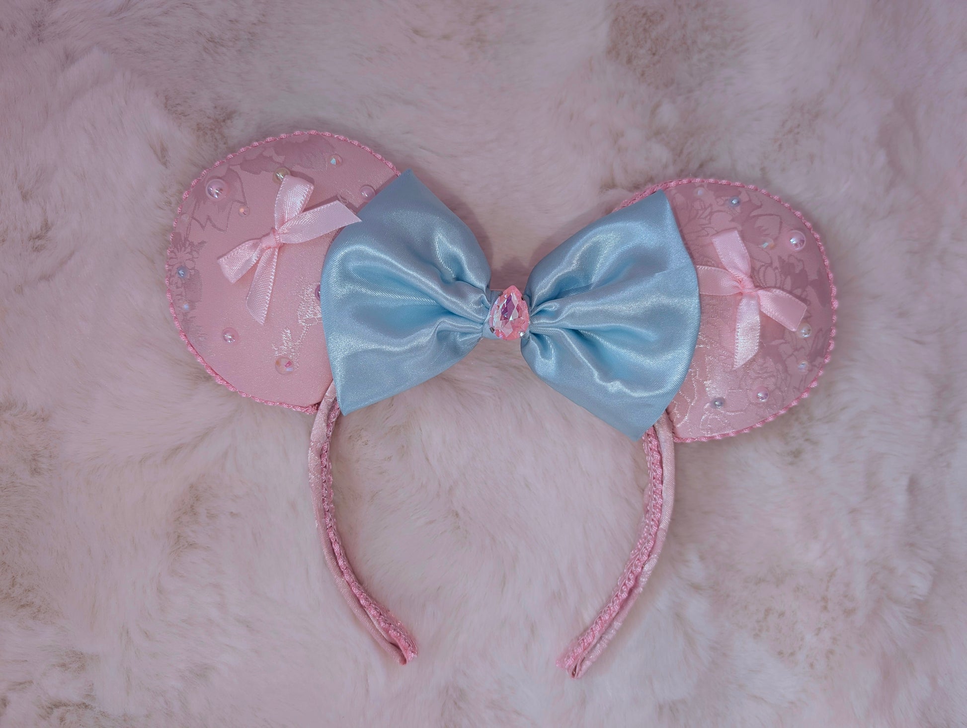 Cinderella Inspired Princess Ears Headband – Pastel Pink Floral Ears with Blue Satin Bow