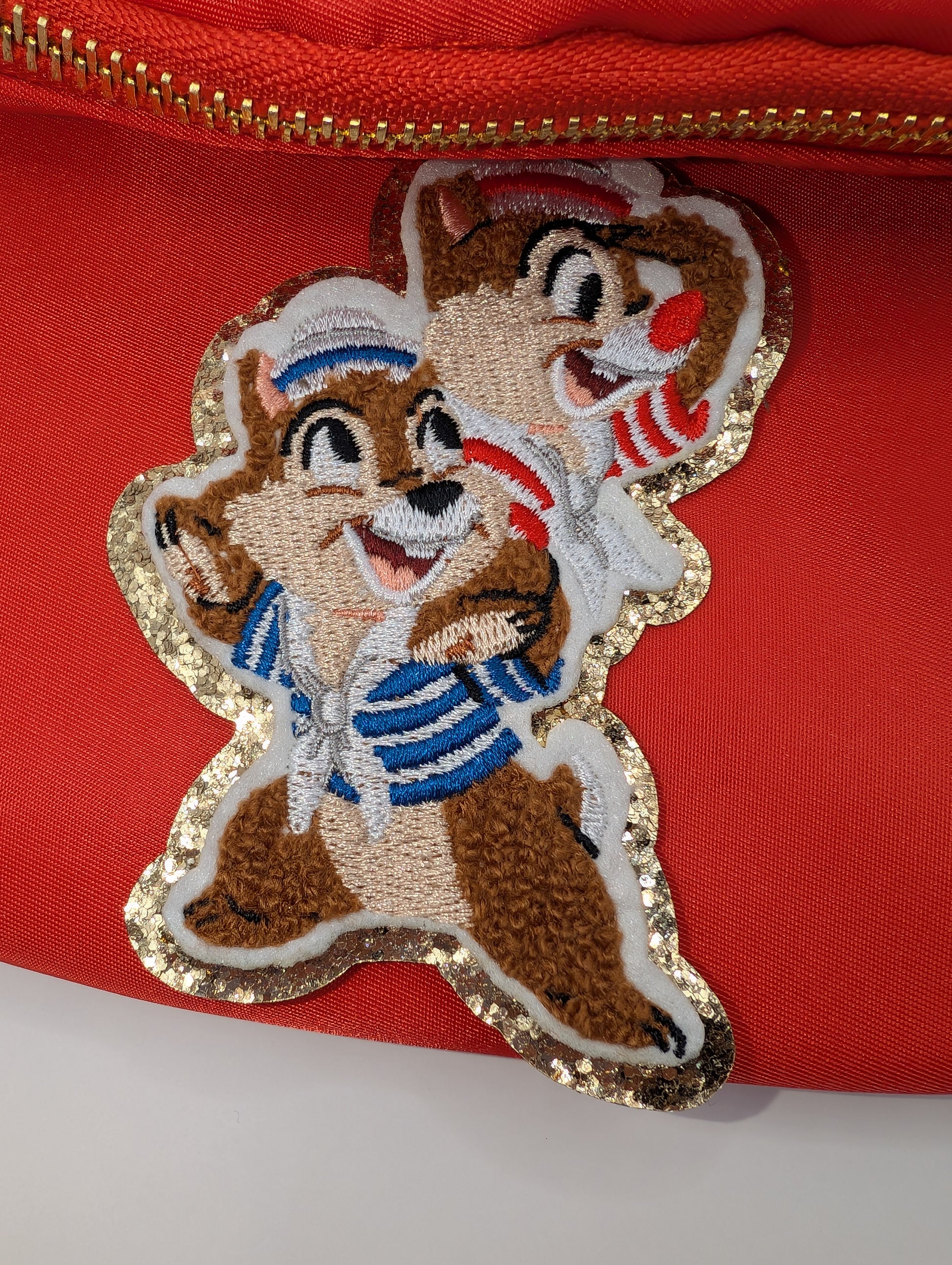 Add playful cruise vibes to your outfits, bags, and crafts with this adorable Chipmunk patch. Featuring the cheeky chipmunks in their sailor outfits, this patch combines soft chenille with detailed embroidery and sparkling gold glitter accents for extra cuteness. 🐿️🚢✨