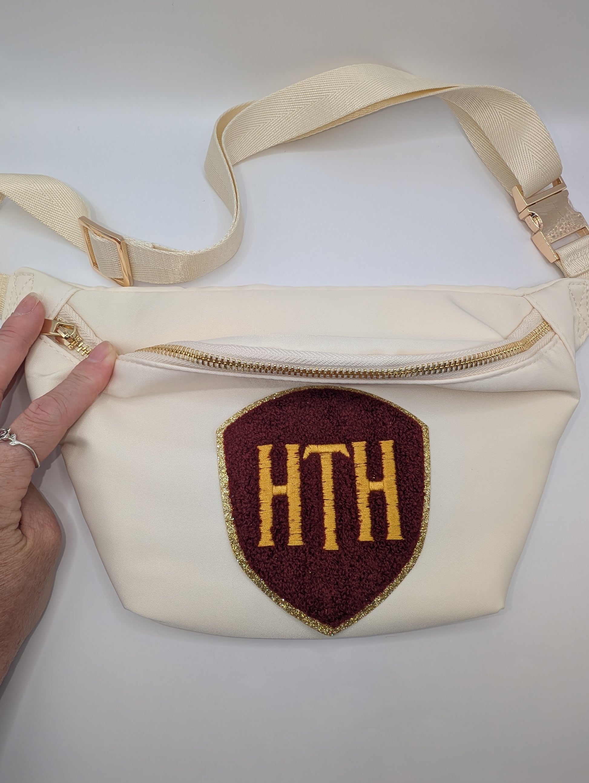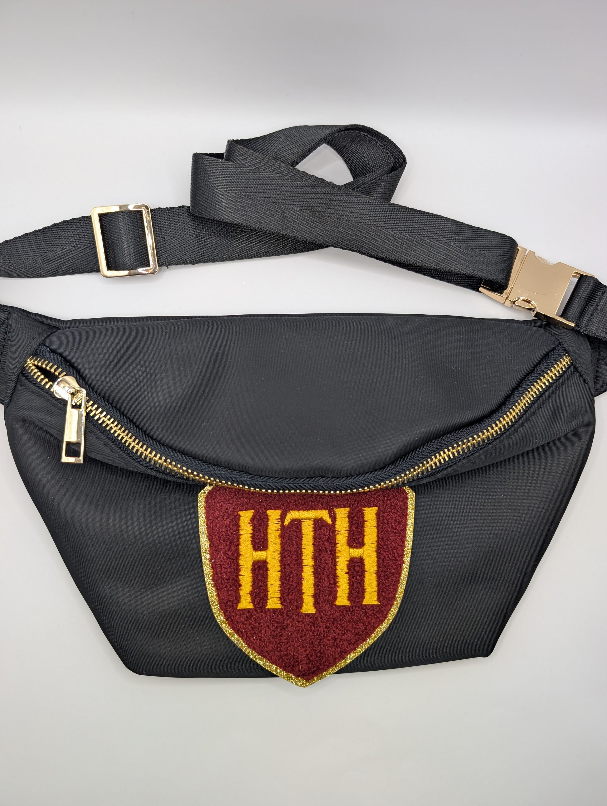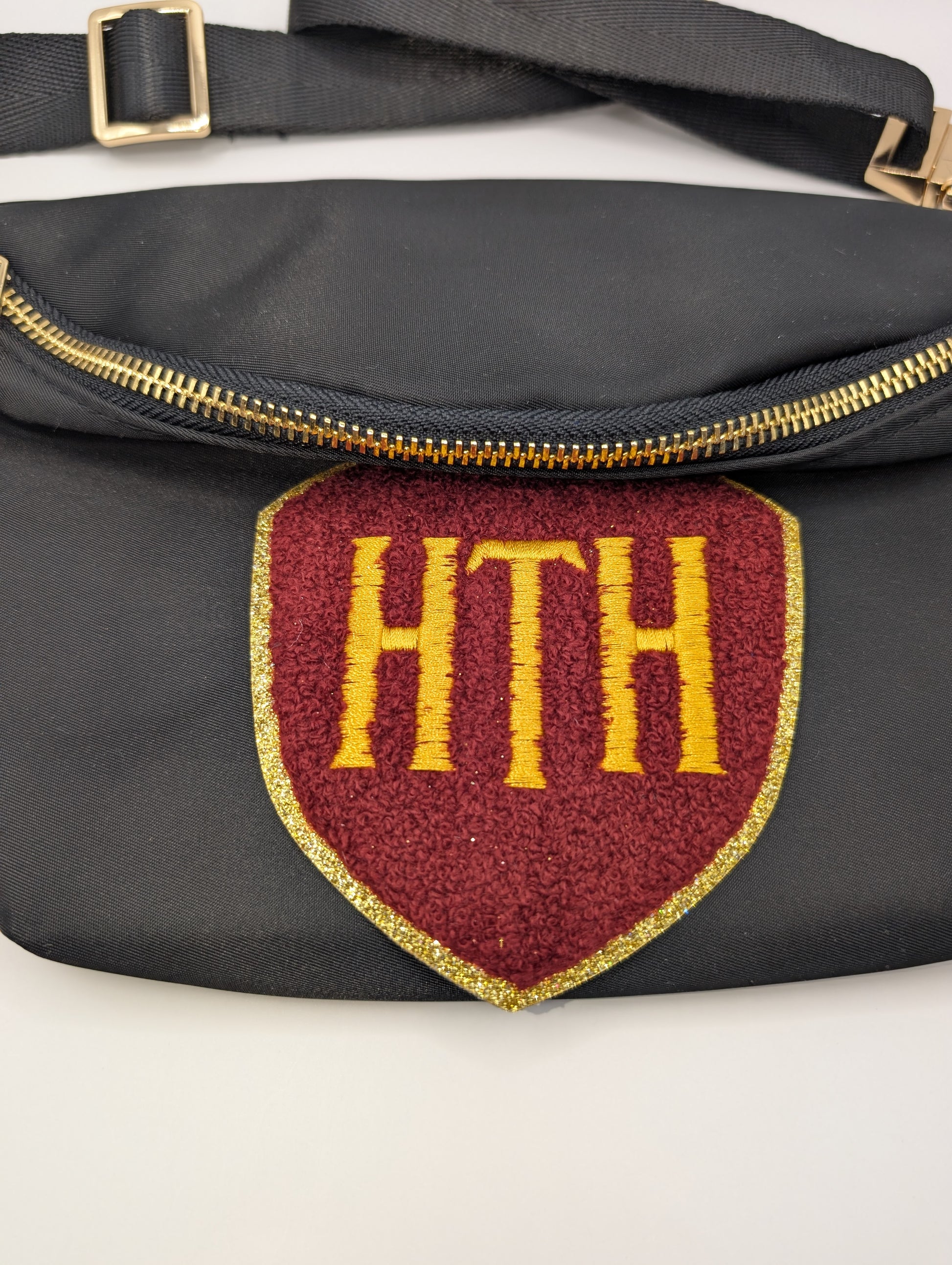 • Soft chenille shield patch with embroidered HTH-style lettering