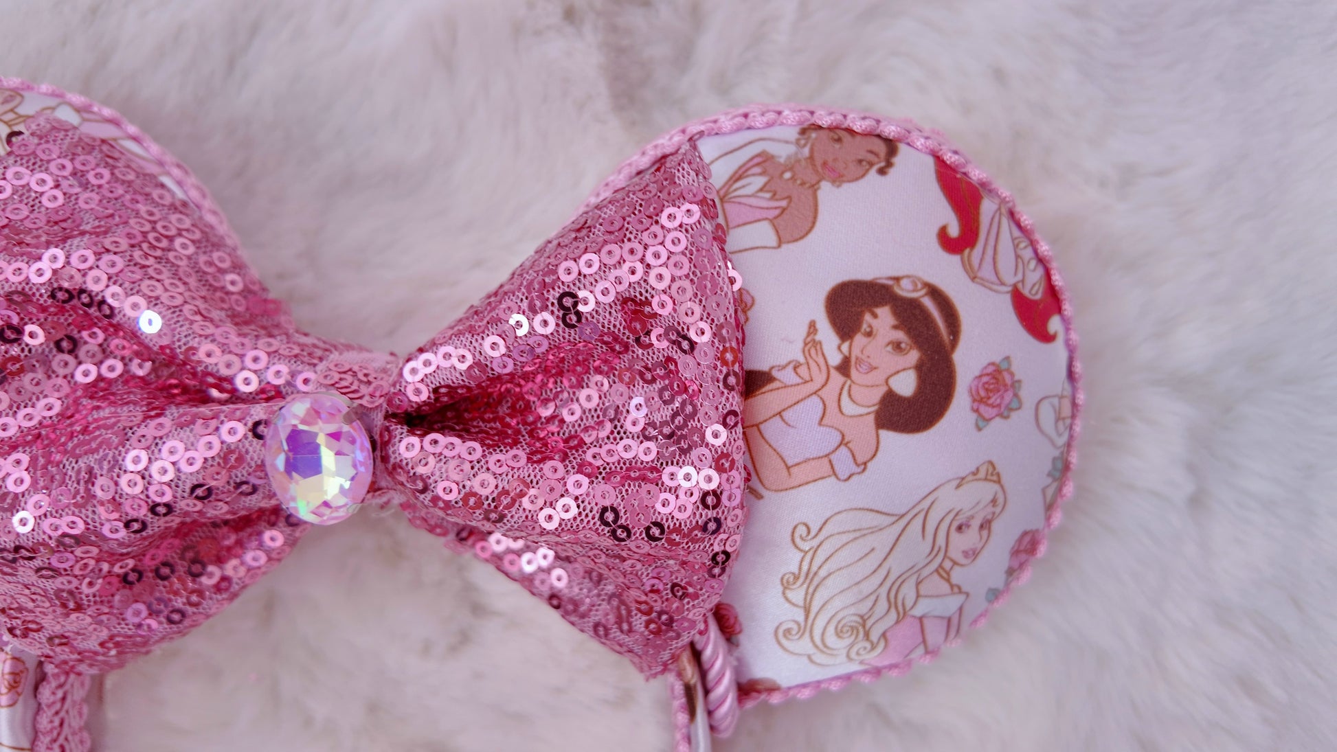 Featuring a soft pink satin base printed with beloved princess characters and a stunning pink sequin bow with a sparkling gem centrepiece, this headband captures the elegance and enchantment of a true fairytale while remaining soft, feminine, and easy to wear all day.